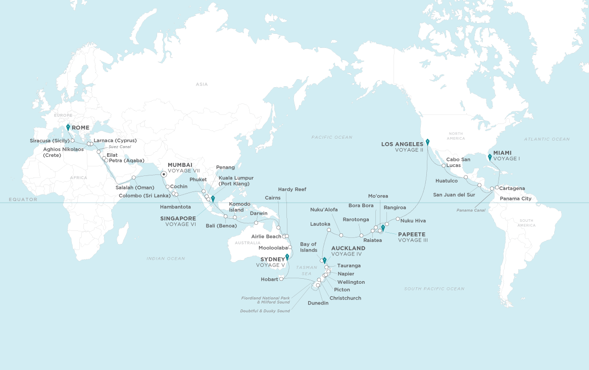 World cruise sailing on Crystal Serenity 105 nights from Miami to Rome.